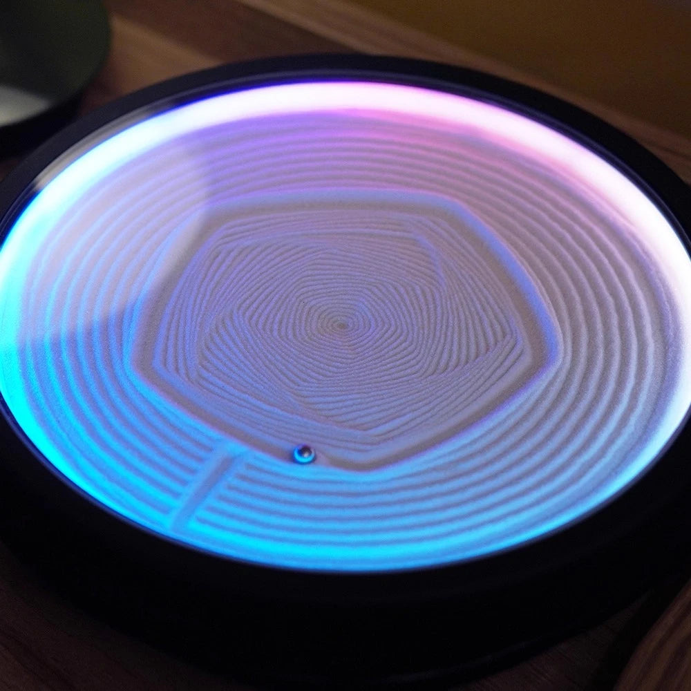 Nach einem hektischen Tag — schalte den Roboter ein. Sieh zu, wie eine kleine Kugel ruhig durch feinen Sand gleitet und immer neue, sanfte Muster entstehen. Der gleichmäßige Fluss, das leise Gleiten, das endlos variierende Bild … alles wirkt beruhigend, fast hypnotisch.